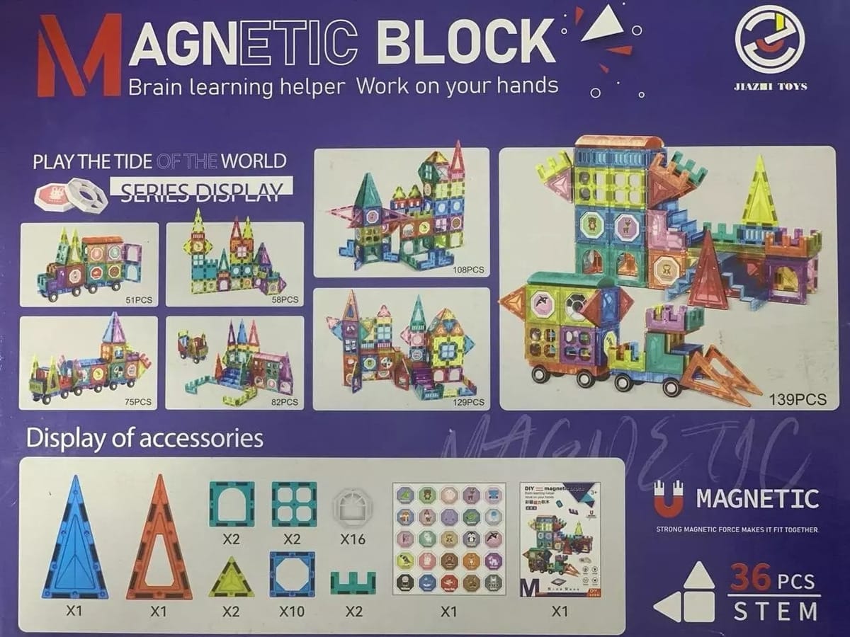 • 🧩 Bloques magnéticos educativos: Incluye 36 piezas con formas geométricas y un vehículo, perfectas para enseñar geometría, colores y números de manera divertida.
