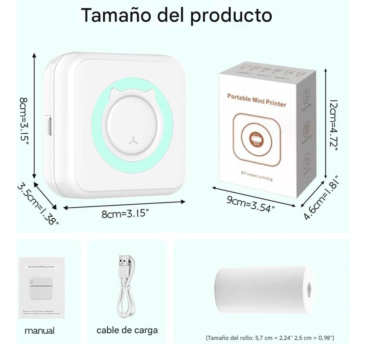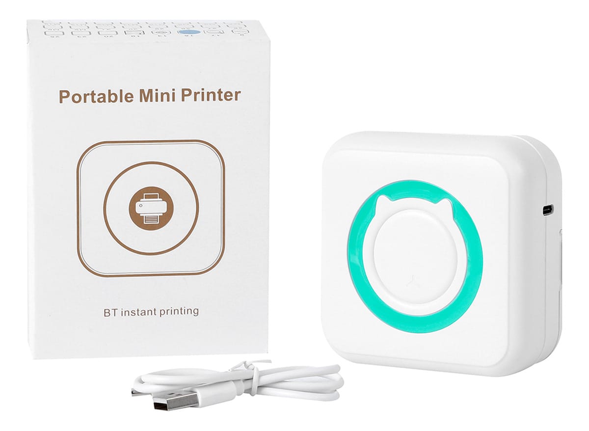 📦 Mini impresora térmica + rollo de papel + cable USB + manual
