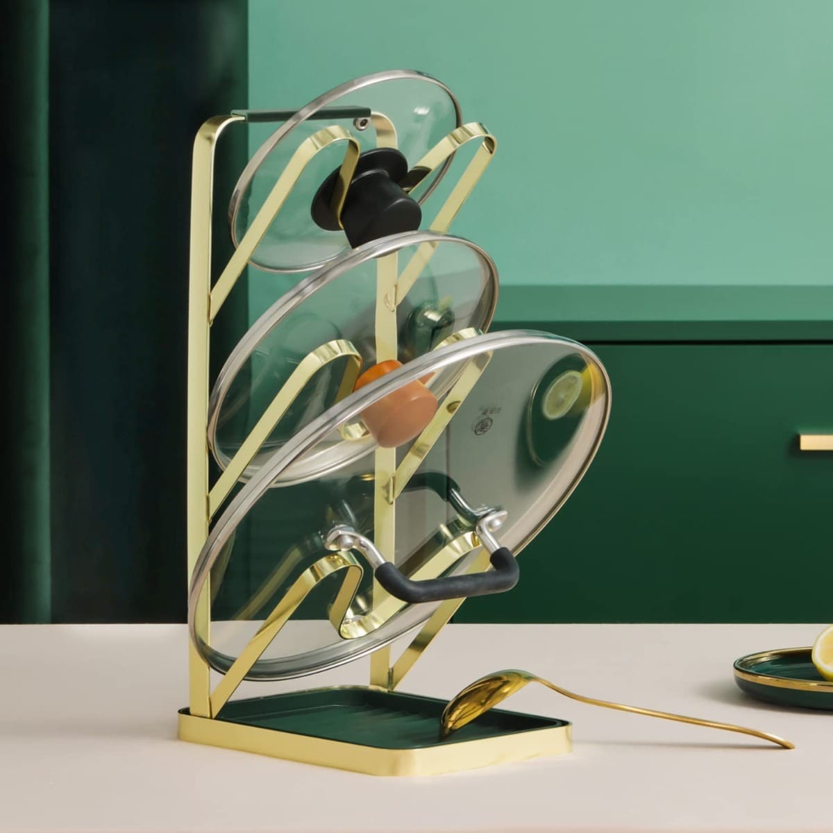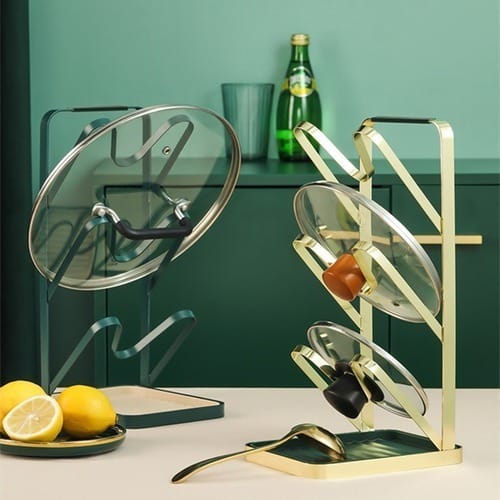Soporte para Tapas de Ollas y Utensilios de Cocina – 3 Niveles | Organizador Green & Gold