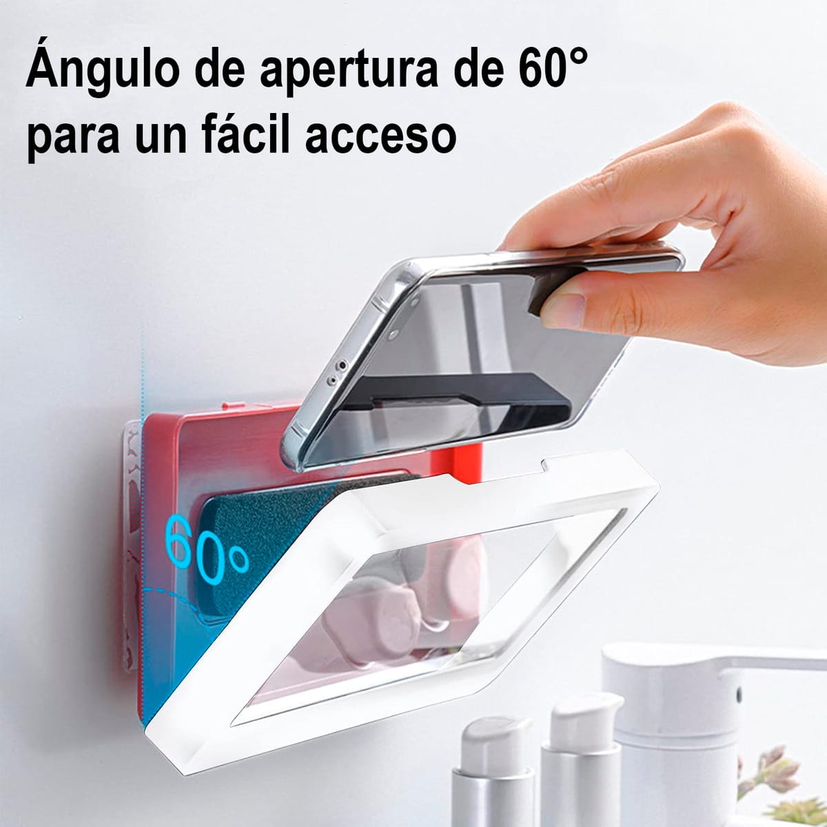 Se fija firmemente a la pared mediante adhesivos de alta adherencia. Incorpora un diseño magnético interno y un ángulo de apertura máximo de 60 grados, brindando una sujeción segura y evitando caídas accidentales del dispositivo.