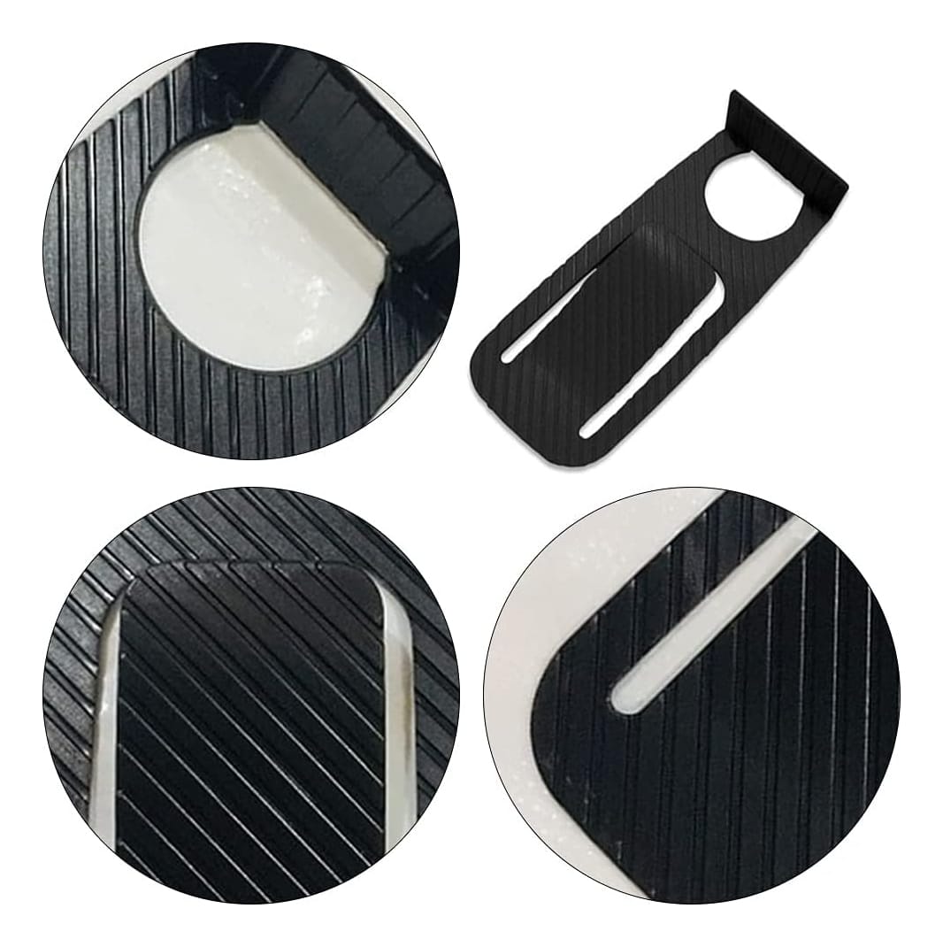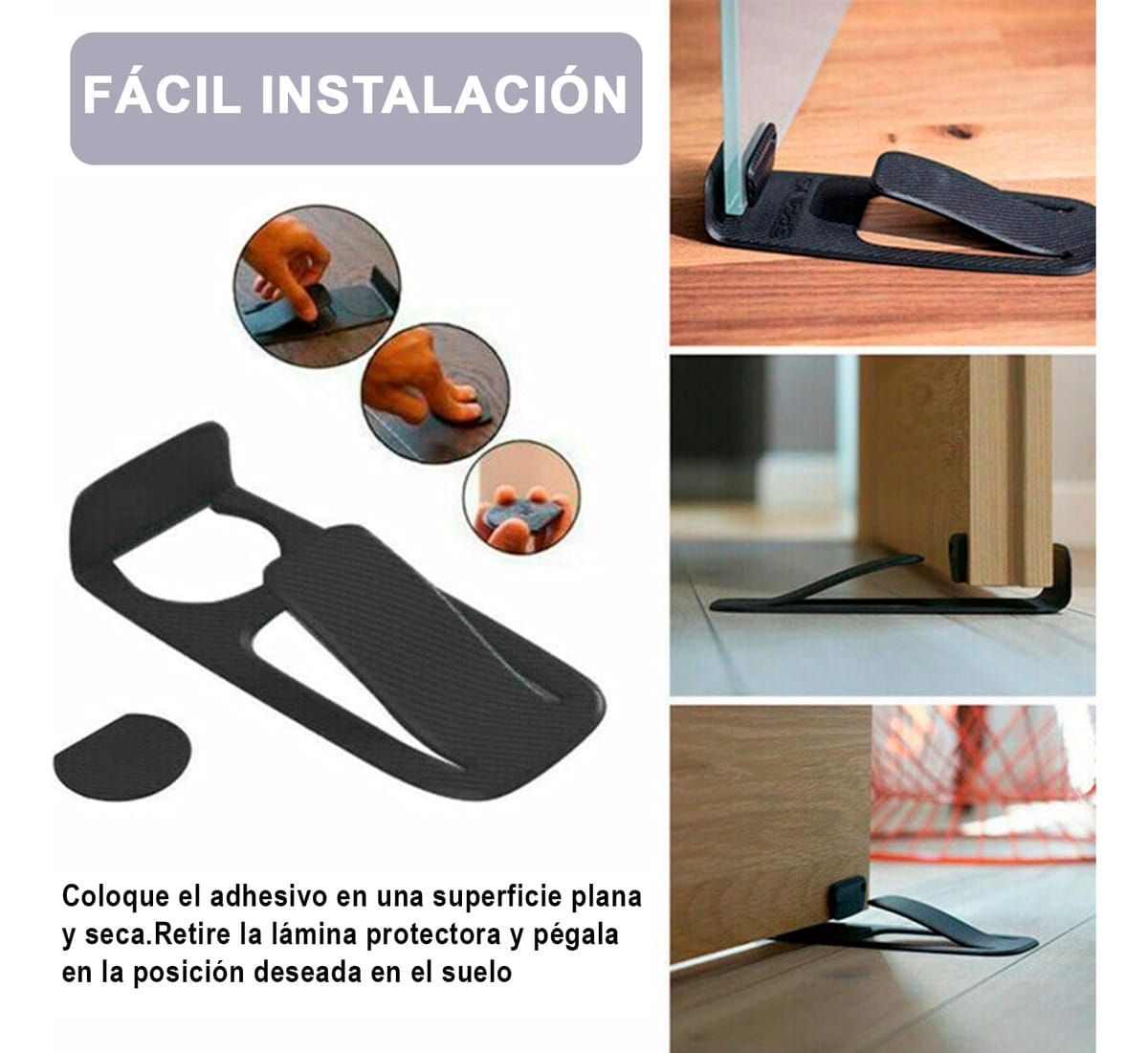 No requiere perforaciones ni herramientas. Solo asegúrate de que la superficie esté seca, retira la lámina adhesiva y colócalo en el piso en la posición deseada. Su diseño compacto garantiza practicidad y discreción.
