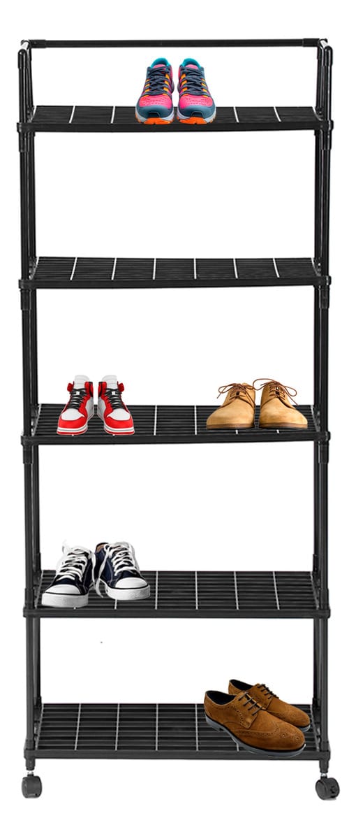El zapatero y estante organizador de 5 niveles es la solución práctica para mantener ordenados zapatos, cajas, electrodomésticos, herramientas y todo tipo de objetos. Gracias a sus ruedas giratorias bloqueables, se puede mover fácilmente y fijar en el lugar deseado sin rayar el suelo.