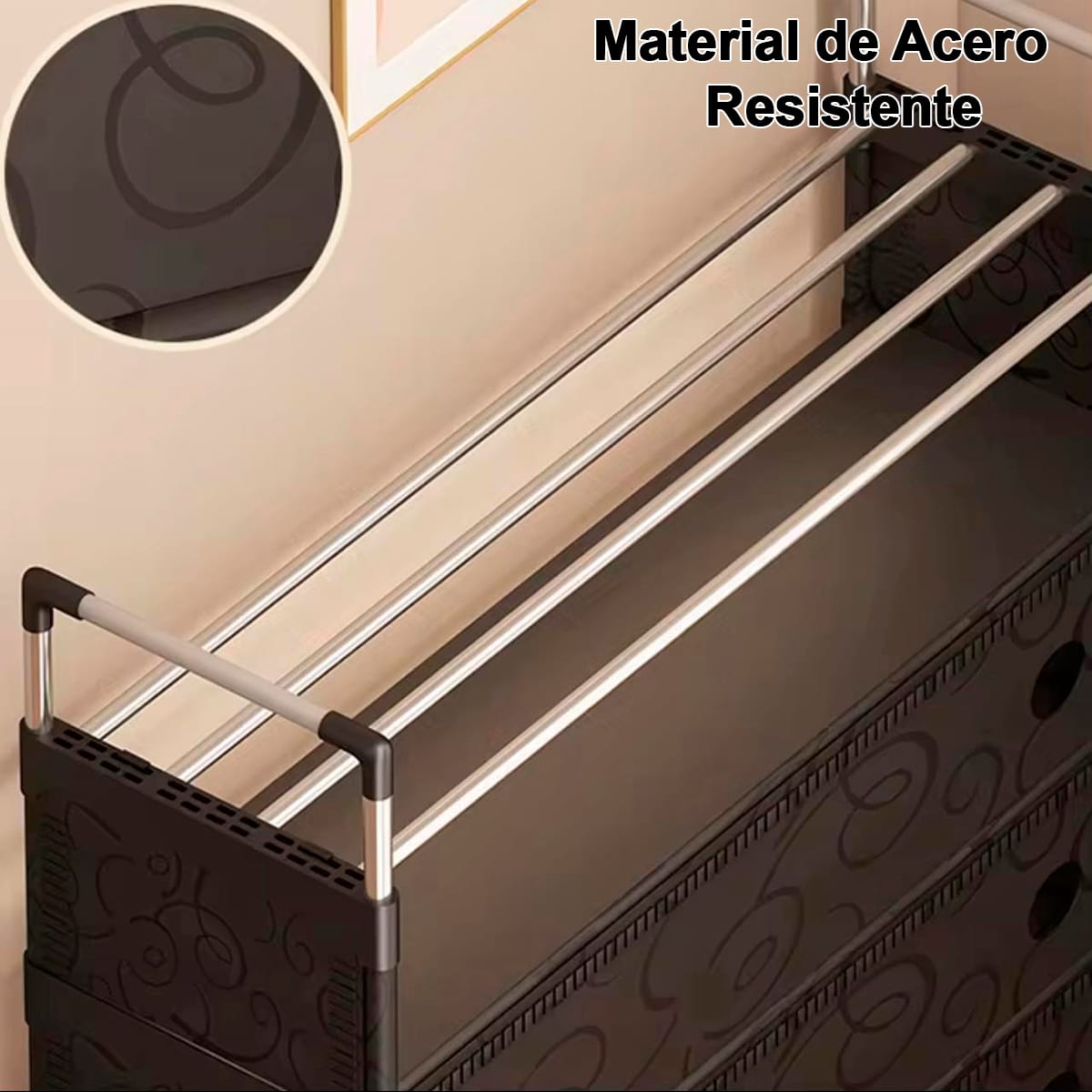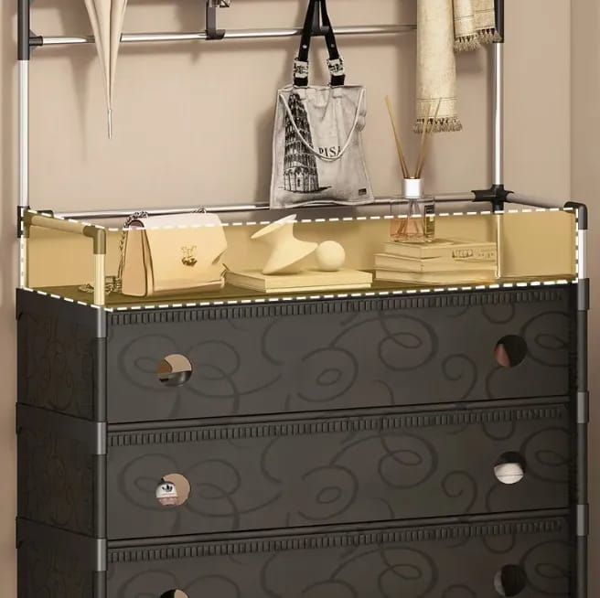 Incluye: Barra de colgar, 9 ganchos superiores, 4 cajones de tela, estante doble para zapatos, ganchos laterales y 4 ruedas giratorias
